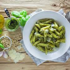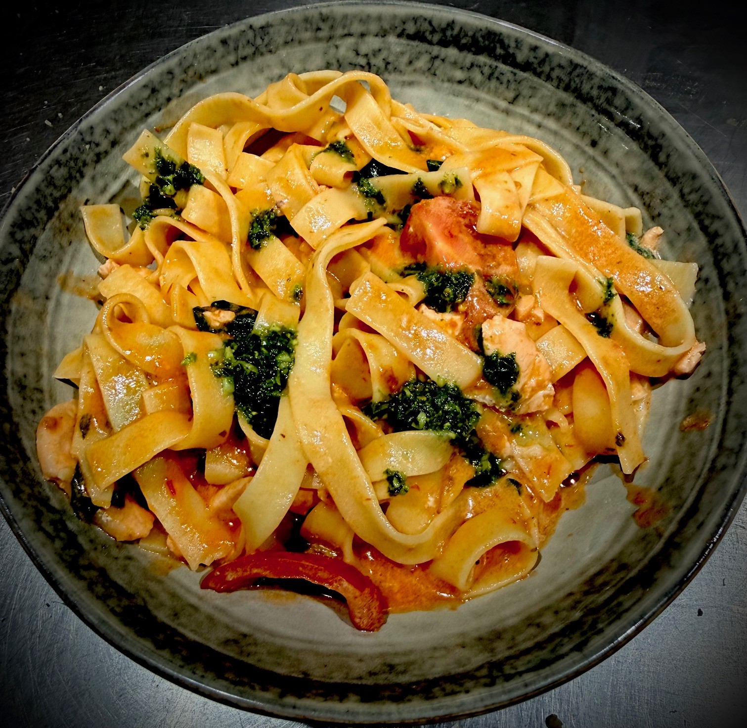 Италиански талиатели, прясна сьомга, спанак, чери домат, сметана, босилеково песто