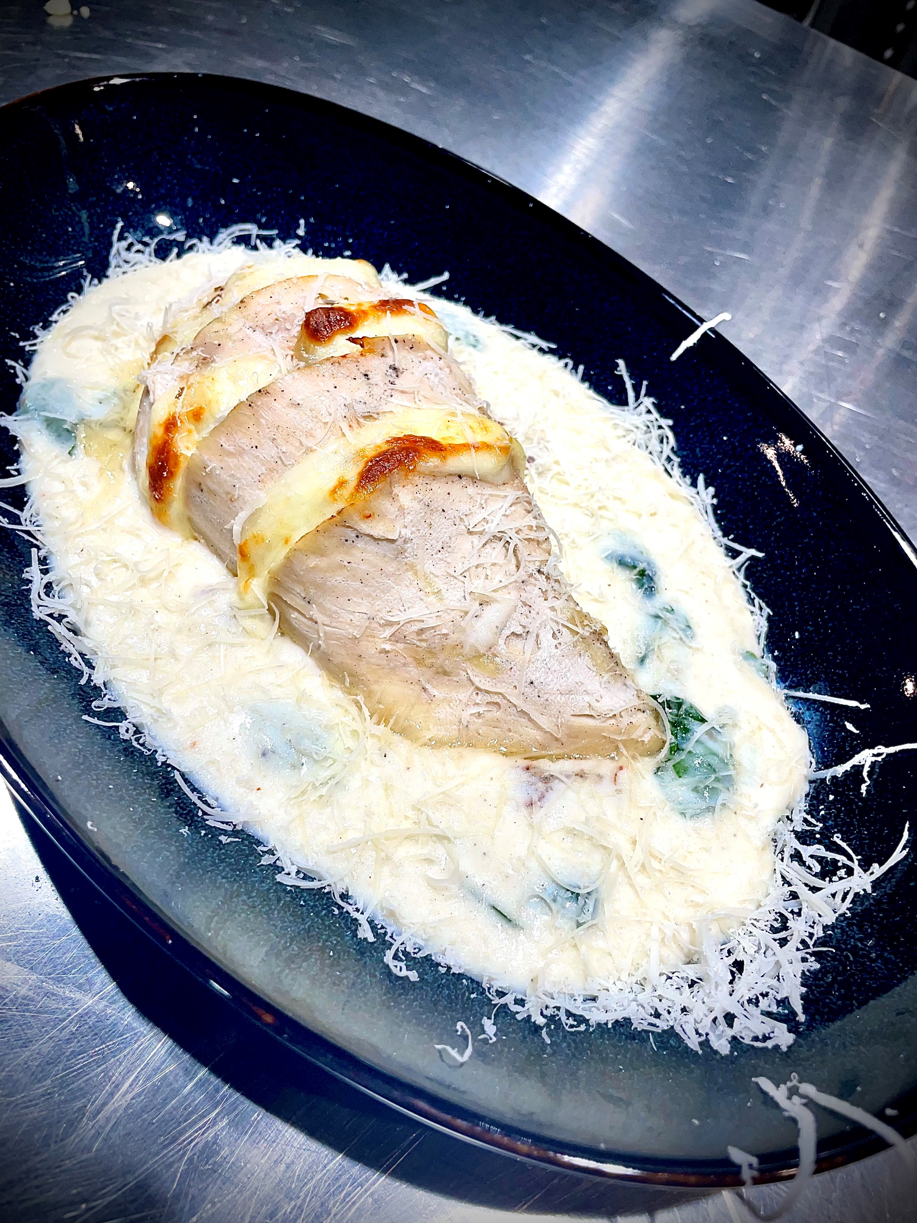 Прясна сьомга, запечена с тиквички, картоф, моцарела, сос Тоскана и босилеково песто