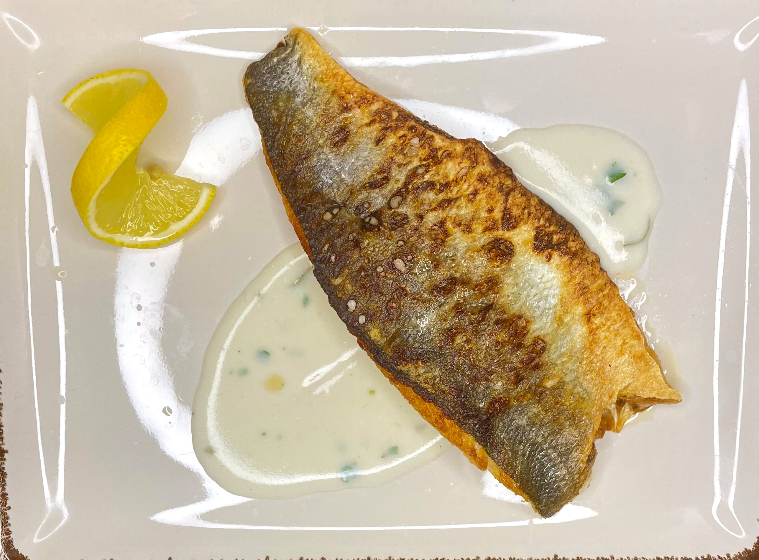 Прясно филе от лаврак, запечено с домат, картоф, каперси, маслини, доматен сос